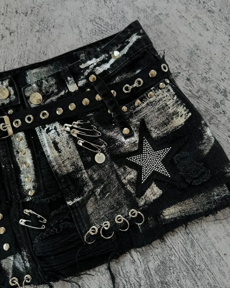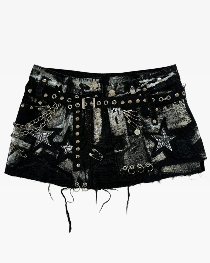 Notre Mini jupe Y2K, faite de matériaux de qualité, présente des étoiles, clous et oeillets style Y2K, une ceinture intégrée, et est disponible en 5 tailles.